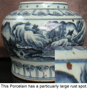 Các đốm gỉ sắt khá phổ biến trên hàng men trắng xanh thời nhà Minh vì những vật này có thời gian tương đối lâu, đủ cho các đốm gỉ đó xuất hiện. Ngoài ra, có vẻ như loại đất dùng để làm hàng gốm sứ thời kỳ đó có chứa nhiều tạp chất hơn cả. Đốm gỉ sắt cũng dễ tìm thấy trong các vật gốm sứ có màu đời nhà Thanh nhưng ít hơn.